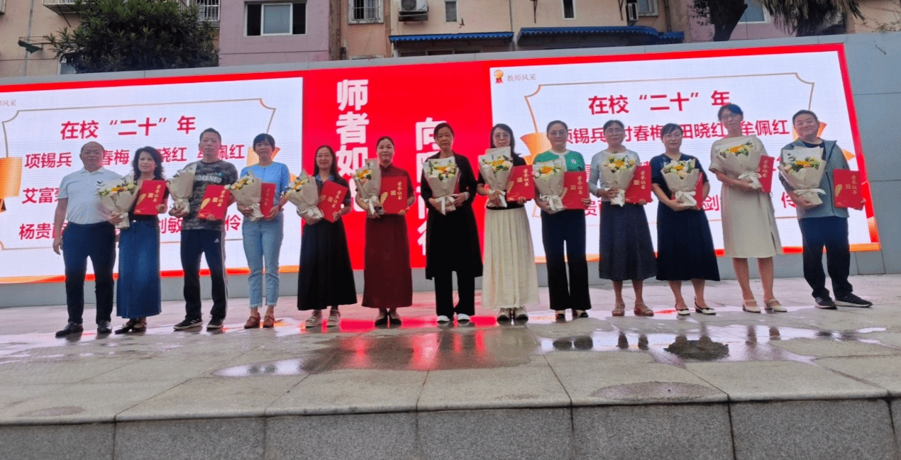 傅相万校长首先为校龄十年的马晓静老师颁发了荣誉证书。马晓静老师代表了学校中坚力量的火热十年,他们用热情与智慧点亮课堂,是学校发展的蓬勃动力。随后,傅相万校长和雷国胜书记分别为在校工作二十年、三十年的教师颁奖。当校龄长达四十年的黄建军老师站上领奖台时,台下掌声雷动,崇敬之情溢于言表。从二十年的“初心如磐”,到三十年的“深耕不辍”,再到四十载的“润泽芳华”,每一段年限,都铭刻着老师们对教育事业的无限热爱与执着坚守。